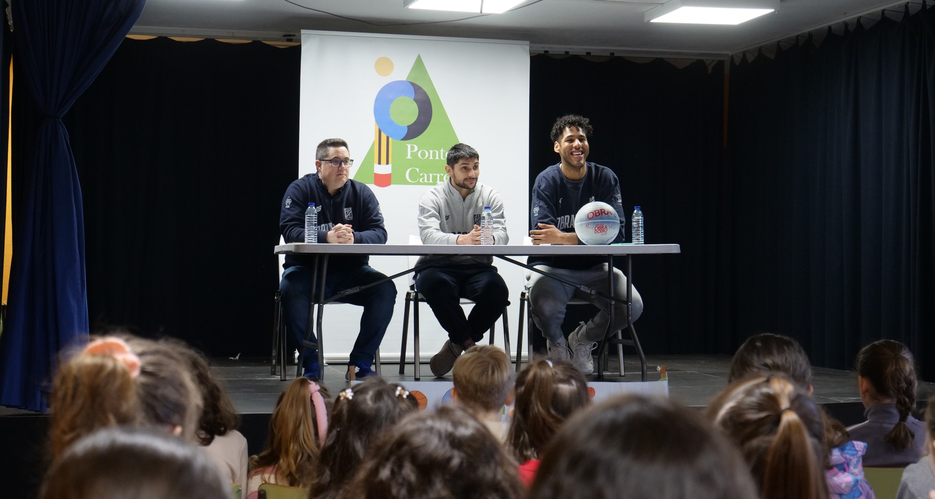 La visita al Colegio Público de Ponte Carreira tuvo lugar con motivo de la rueda de prensa oficial de la jornada 26 de la Primera FEB, en la que nuestro entrenador Diego Epifanio atendió a los medios de comunicación. Tras finalizar este encuentro profesional, se dio paso a una actividad muy especial: la rueda de prensa escolar, en la que los alumnos y alumnas asumieron el papel de periodistas y pudieron entrevistar al propio Diego Epifanio acompañado por Sergi Quintela y Felipe Dos Anjos.