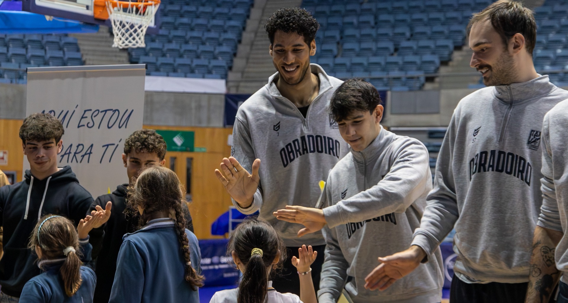 Más de 200 alumnos de 5º de Primaria y 3º de ESO del Colegio Peleteiro participaron esta mañana en una ceremonia de apadrinamiento, que tuvo lugar en el Multiusos Fontes do Sar con los jugadores del primer equipo. El acto comenzó con la lectura, por parte de una estudiante de 2º de Bachillerato, de la carta a través de la que se le pidió al club convertirse en padrinos: “Los valores del deporte que demostráis —el respeto al rival, el trabajo en equipo y el no rendirse nunca— son la lección más importante que nos dais. Vuestro lema Todos Xuntos nos ha inspirado. Resume lo que vale el esfuerzo conjunto. Por eso, y porque sois un ejemplo brutal de valores, os pedimos algo super especial: ¿Aceptáis ser nuestros Padrinos de Honor de la primera promoción TEI del Colegio Peleteiro?”, y a continuación asignaron un valor a cada uno de los jugadores por lo que representan: trabajo en equipo, perseverancia, honestidad, coraje, resiliencia, generosidad, respeto, esfuerzo, sentido de pertenencia, responsabilidad, empatía, solidaridad y disciplina.